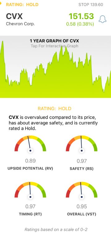 Each of these sits on a scale of 0.00-2.00 with 1.00 being the average, allowing for quick and easy interpretation. Better yet, you’re given a clear buy, sell, or hold recommendation for any given stock at any given time based on its overall VST rating. Here’s the situation for CVX: