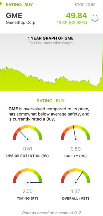 - Excellent Timing: The RT rating is based on the direction, dynamics, and magnitude of the stock’s price movement. It’s calculated day over day, week over week, quarter over quarter, and year over year. This is where things get interesting, as GME is tipping out the scale with an RT rating of 2.00.