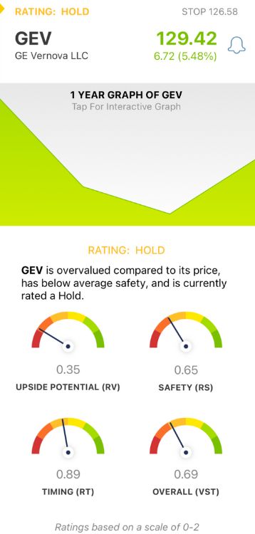 Better yet, the system gives a buy, sell, or hold recommendation for any given stock at any given time based on its overall VST rating. Here’s what we found for GEV: