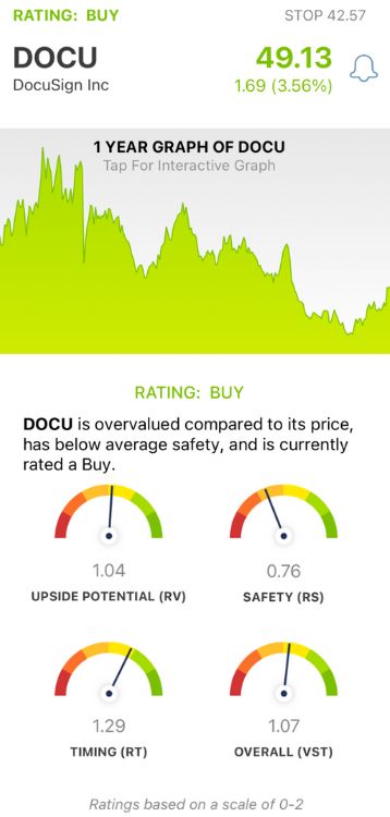Each rating sits on its own scale of 0.00-2.00 with 1.00 being the average. This makes interpretation quick and easy. But, you’re even offered a clear buy, sell, or hold recommendation for any given stock at any given time based on the overall VST rating. As for DOCU: