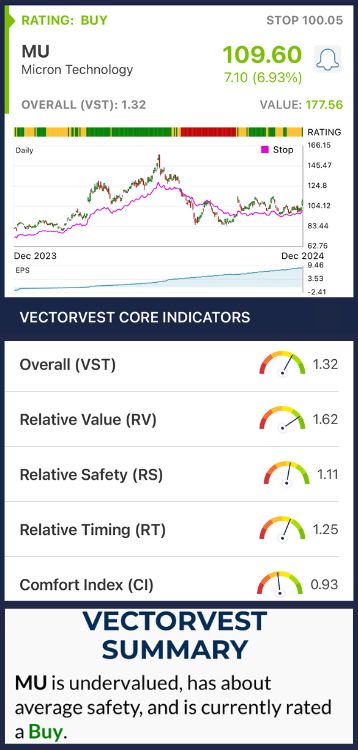 VectorVest advocates buying safe, undervalued stocks, rising in price. MU surged over 6% ahead of its upcoming earnings, driven by optimism around easing DRAM inventory challenges and strong government investments. Despite analysts forecasting a potential earnings miss, the stock demonstrates strong upside potential, fair safety, and very good timing.